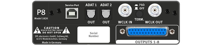オプションの AD コンバーターがないバージョンでは、P8 の出力段に DB25 ソケットが 2 つあります。これらは両方とも、マイクプリアンプ1から8からのアナログラインレベル出力信号を供給します。アナログ出力信号は、例えばマルチチャンネルADコンバーターに接続することができ、DB25入力はこのタイプの機器と共通で、並列に2台目の録音機器に接続することができます。