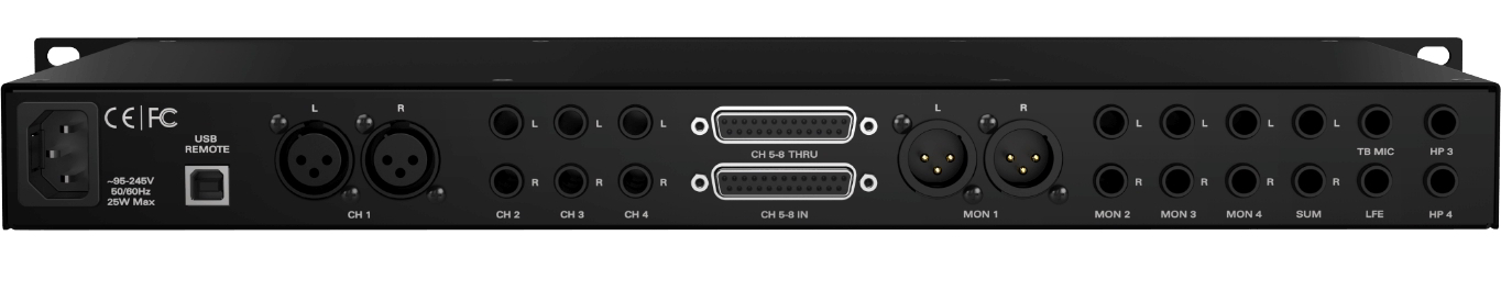 豊富な接続オプションを持つ Satori は、どんなスタジオでも完璧に対応し、ユーザーに究極の柔軟性を与えます。8 つのステレオ入力端子、4 つのステレオ入力と 4 つの出力を備え、接続のオプションは XLR、XLR, 1/4 インチ TRS、D-Sub 25 があり、この 1U ユニットはそのクラスの中では特徴的なものです。 4 つのステレオスピーカー出力端子に加え、Satori はサブウーファー専用出力を備えます。またこの機器にはD-Sub 25 コネクターを搭載し Orion32 のようにマルチチャンネルコンバーターへの接続を容易にこなします。
