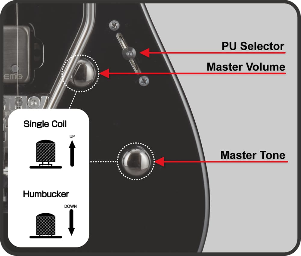 - Master Volume(w/Pull: Neck PU Single Coil Mode), Master Tone(w/Pull: Bridge PU Single Coil Mode), 3WAY Lever PU Selector