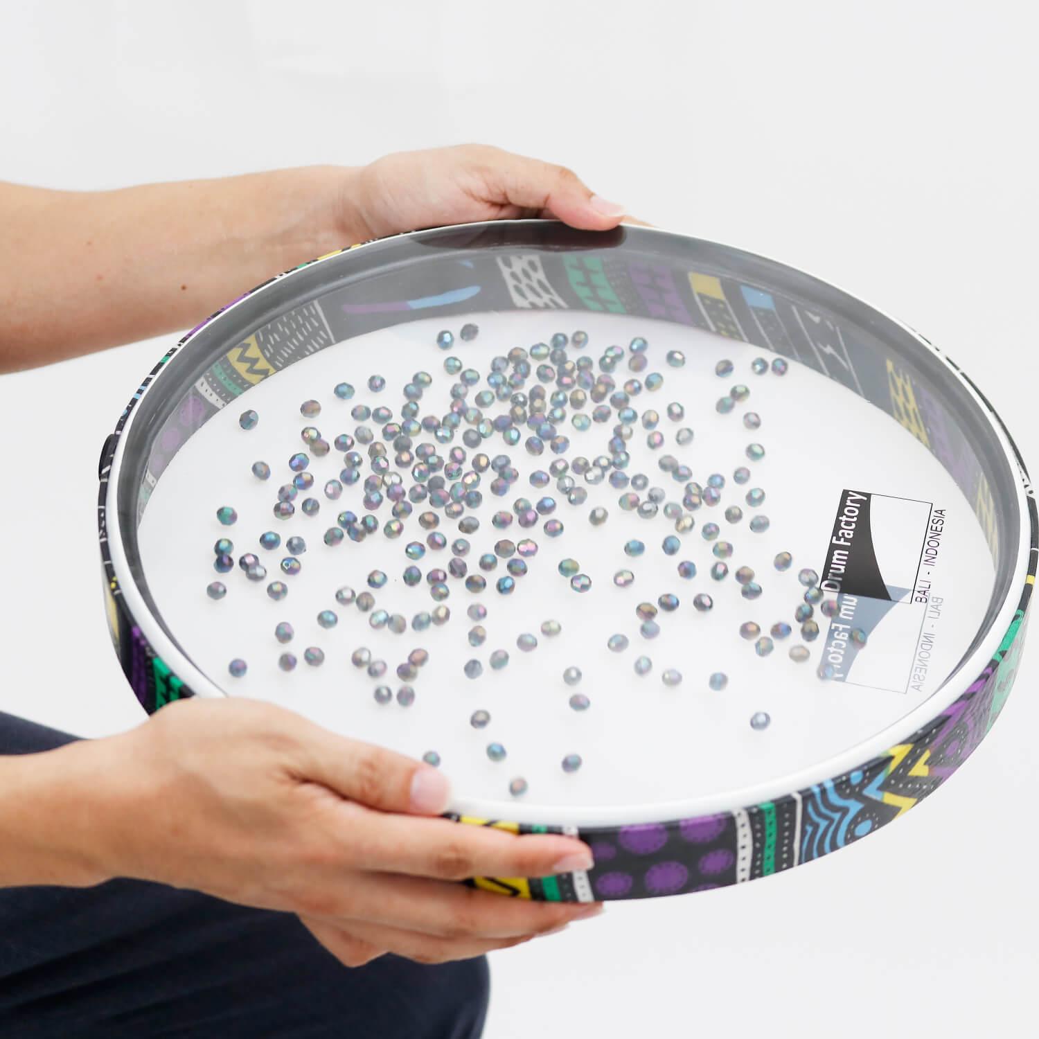 波の音を再現できる、Mサイズのオーシャンドラム。ドラムを水平に構え、ゆっくりと傾けることで、砂や小粒が内部を滑らかに移動し、まるで本物の波のような癒しのサウンドを演出します。音楽演奏のアクセントとしてはもちろん、リラクゼーションやサウンドセラピーにも最適な楽器です。