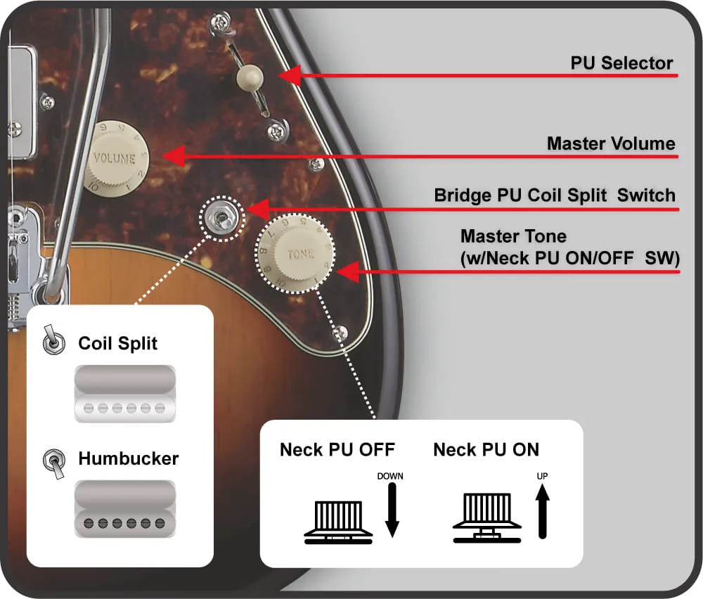- Master Volume, Master Tone (Neck PU ON/OFF SW), 5-Way Lever PU Selector, Bridge PU Coil Split Switch
