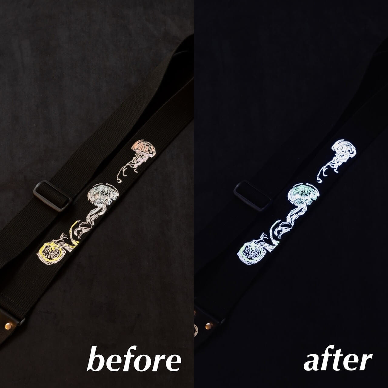 クラゲ刺繍は蓄光糸を採用しており、なんと暗闇でぼんやり光ます!