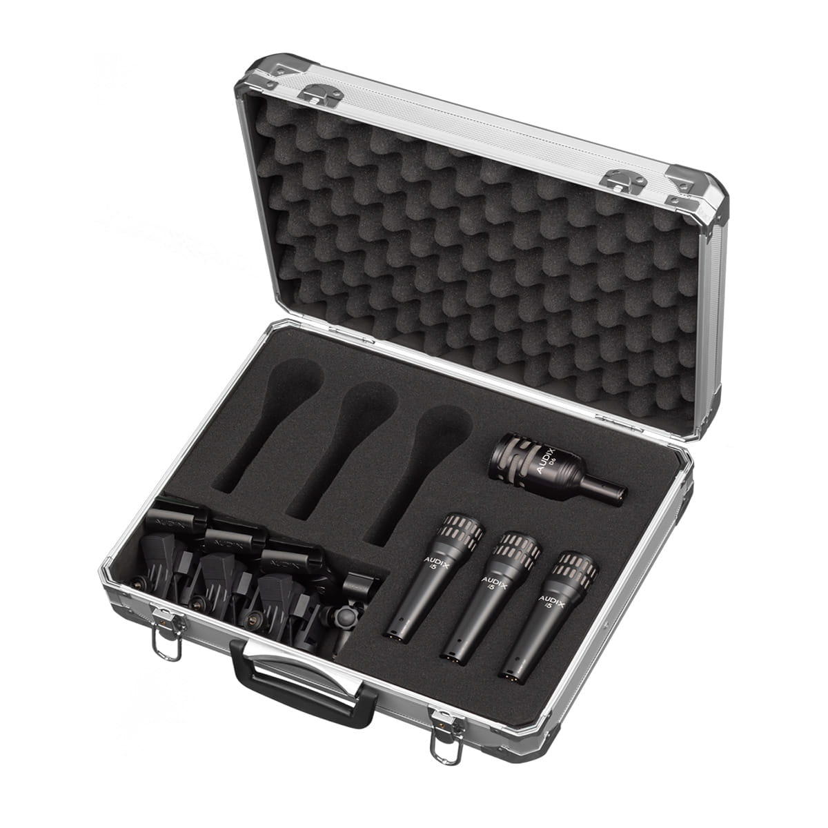 裏地がクッションフォームのアルミ製キャリングケースが付属、これらのセットの持ち運びや保管が可能です。キャリングケースにはさらに3本のヴォーカル用ハンドヘルドマイクを収納可能です。