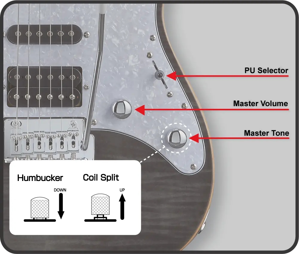 - Master Volume, Master Tone(w/Bridge PU Coil Split), 5 Way Lever PU Selector