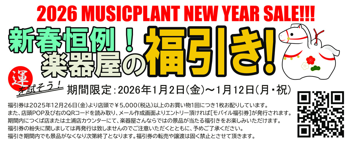 年に一度の運試し。何が出るかはお楽しみ。楽器屋さんならではのグッズがいろいろ当たります。 特賞はなんと!・・・ 期間は初売りの1/2から1/12までの11日間! 福引券はお買い物でも、店頭POPでも、こちらのバナー内QRコードからもGETできます。 お正月はミュージックプラントで福引きだー!