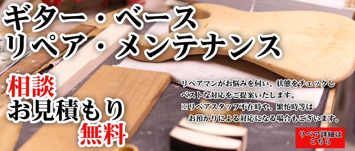 あなたの楽器、弾きにくくなっていませんか?リペア・改造はもちろん各種調整も承ります。 各種作業は店舗カウンターにて随時受付しておりますので、お気軽にご相談ください。 バナーを押すとリペアホームページを確認頂けます。